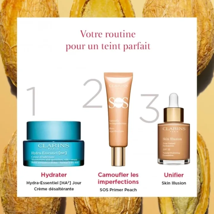 - Appliquez le matin après votre soin habituel, seul ou mélangé à votre fond de teint fluide Clarins.