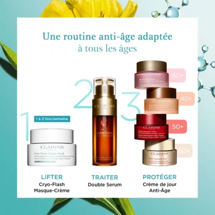 Les Laboratoires Clarins ont mis au point une double technologie moléculaire et végétale capable de reproduire les mécanismes du froid sur la peau pour lutter contre les signes de l’âge : INNOVATION CRYO-STARTER TECHNOLOGY composée d’un duo d’actifs phares : molécule M.G.A., dérivé de menthol + extrait d’onagre.