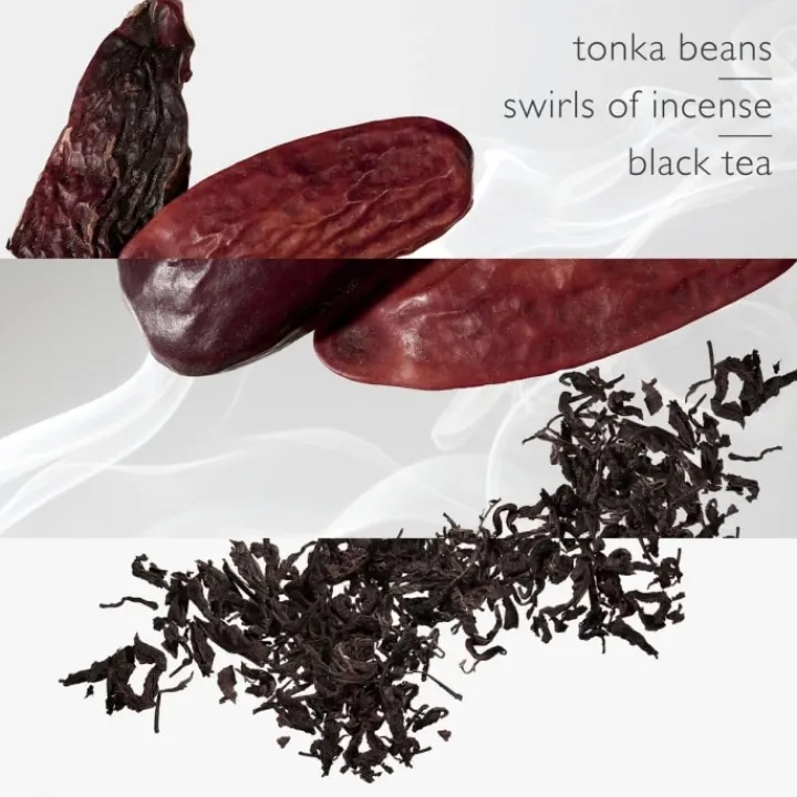 Pour cette fragrance boisée et mystérieuse, la fève tonka sensuelle et l’encens enveloppant sont soulignés par la profondeur du thé noir.