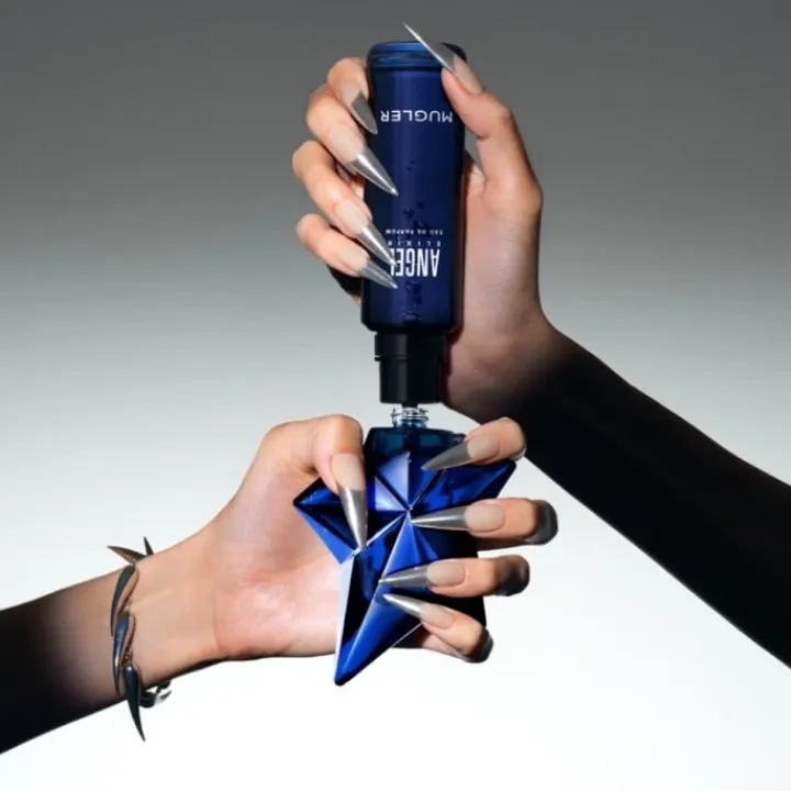 Angel Elixir est encapsulé dans le flacon étoile devenu iconique d’Angel Eau de Parfum, habillé d’un voile bleu foncé, profond et mystérieux.