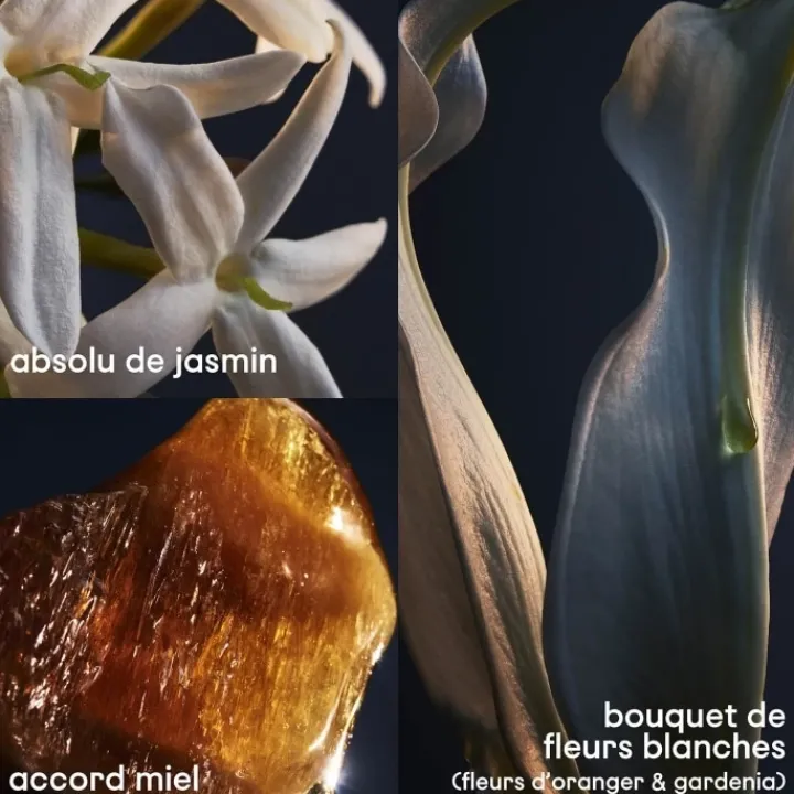 Fleurs blanches opulentes et fraîches. Glamour. Miel et patchouli sexy. Addictif jusqu’à l’obsession. Néroli, bigarade et framboise Absolu de fleur d’oranger, absolu de jasmin Miel et patchouli