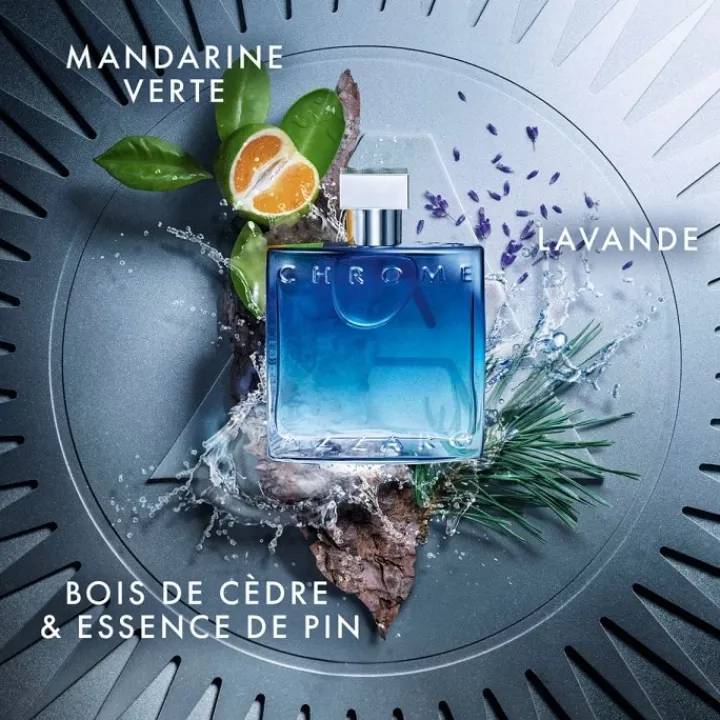 Son nouveau flacon, entre ciel et mer, exprime la dualité de sa fragrance: celle de la rencontre entre la fraîcheur emblématique de Chrome et des notes boisées intenses, révélant un caractère masculin élégant et profond.