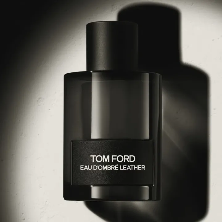 L’Eau d’Ombré Leather est présentée dans un flacon noir translucide avec une plaque en faux cuir.