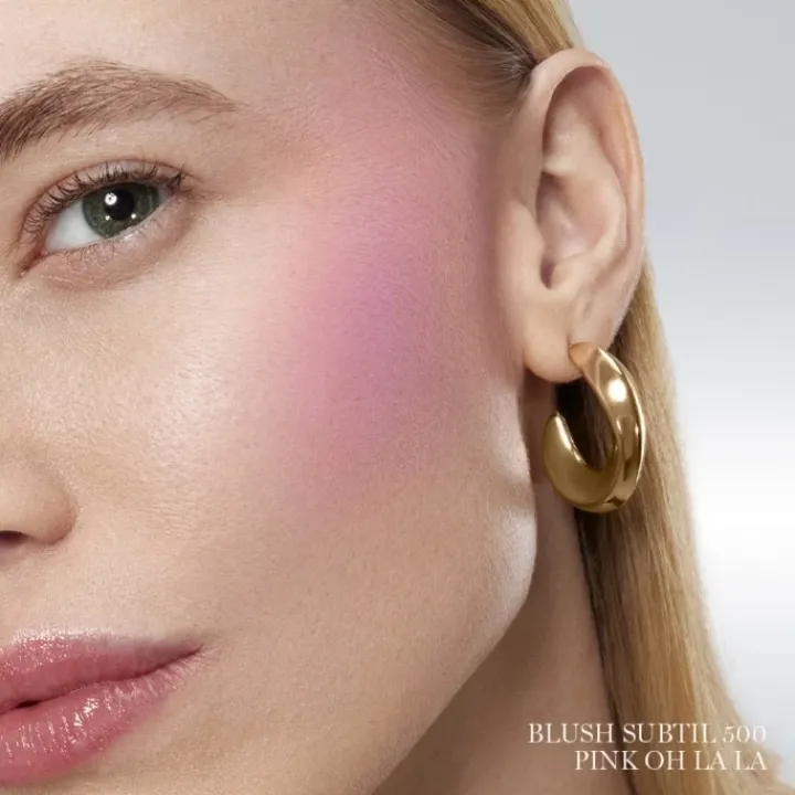 - Jouez avec des teintes complémentaires pour sculpter et définir les contours de votre visage. Appliquez Blush Subtil sur vos joues avec l’aide du pinceau puis étirez la matière vers vos tempes pour mettre en lumière la zone à sculpter.