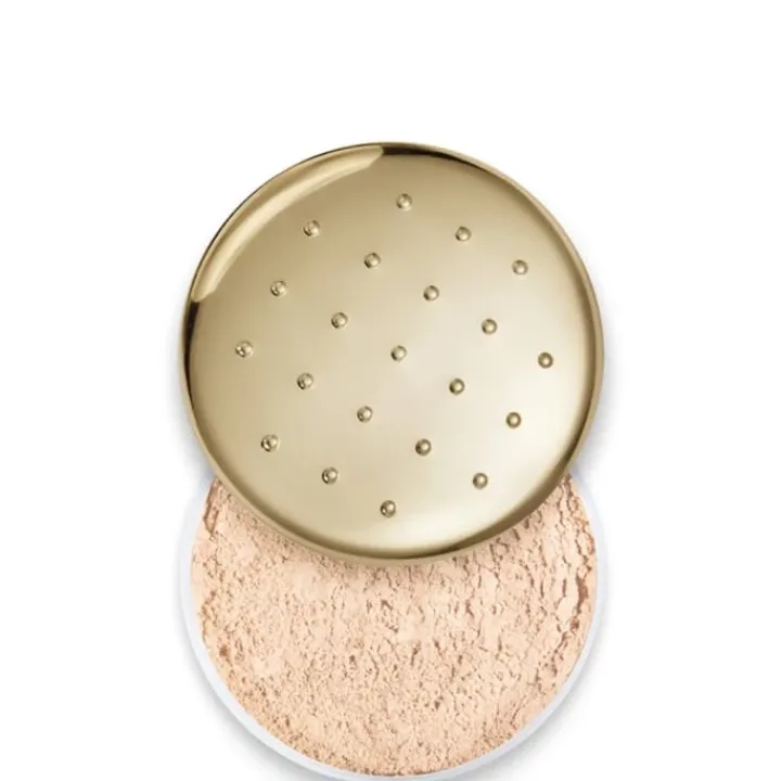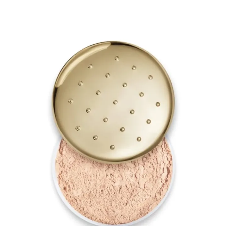 - Présentée dans son boîtier galbé doré à picots la poudre libre s’applique généreusement à la houppette.