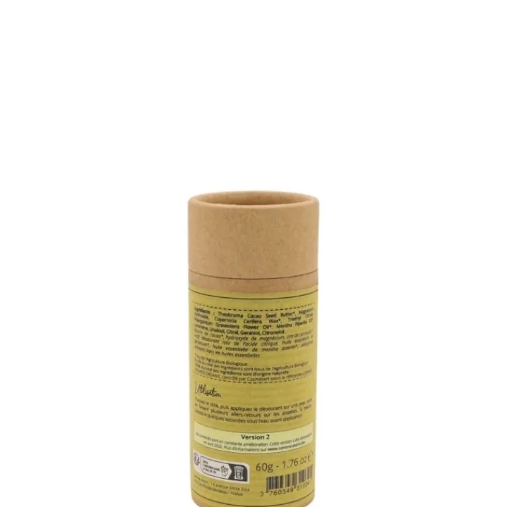 - Sans bicarbonate de soude, sans alcool, sans sel d’aluminium, sans huile de palme