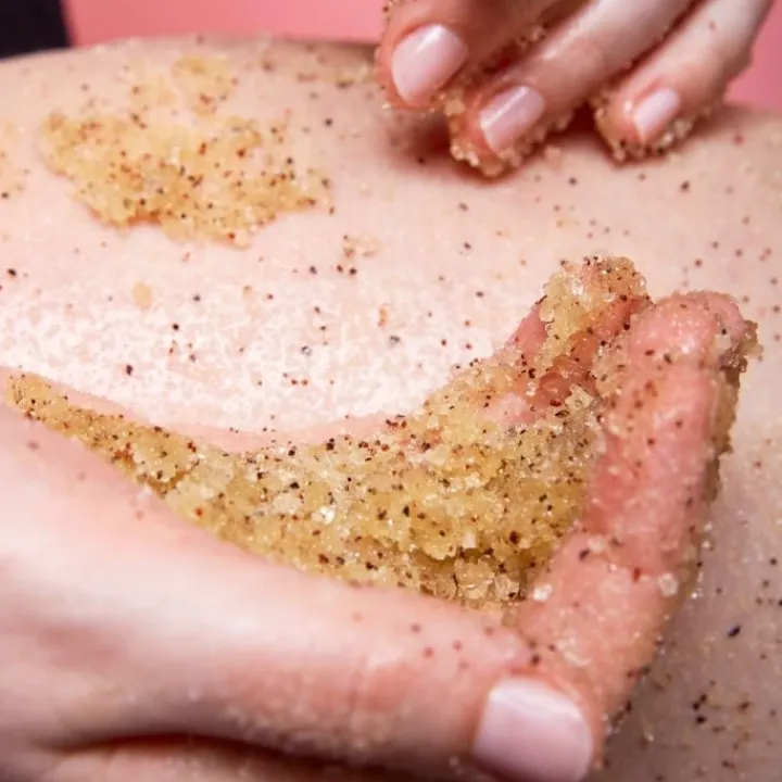 - Appliquez votre gommage 1 fois par semaine directement sur le corps préalablement humidifié et massez en mouvements circulaires.