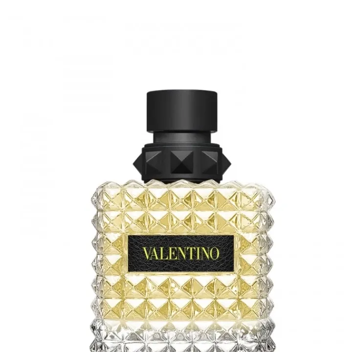 Le flacon reprend l’iconique clou Valentino : inspirée de l’architecture romaine, cette forme pyramidale donne au flacon son côté moderne. Le verre multi-facette est dynamisé par une signature jaune fluo.