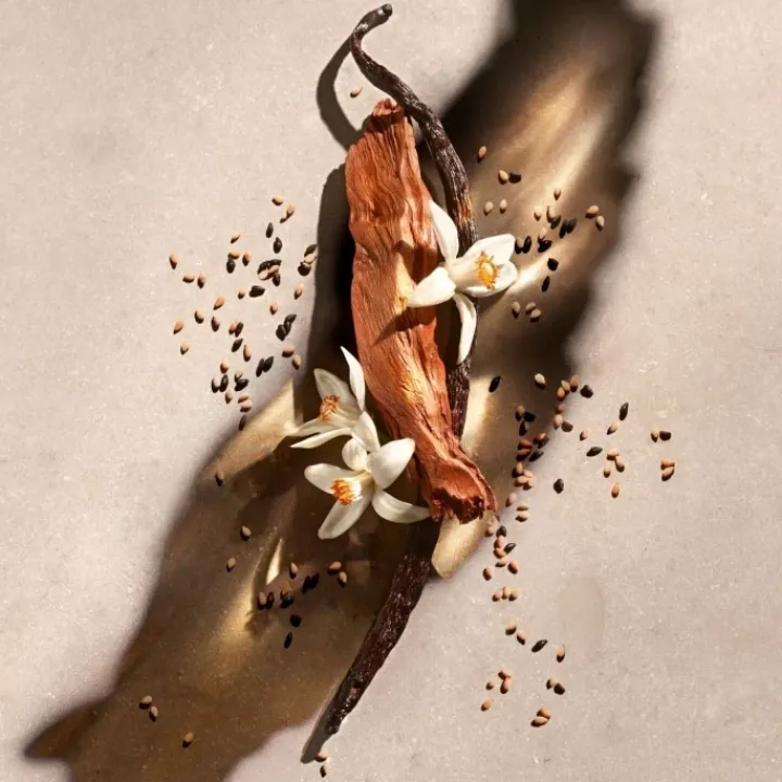 En notes de tête, un duo de sésame noir et blanc ouvre le parfum, laissant place en notes de cœur à un accord lumineux de fleur d’oranger.
