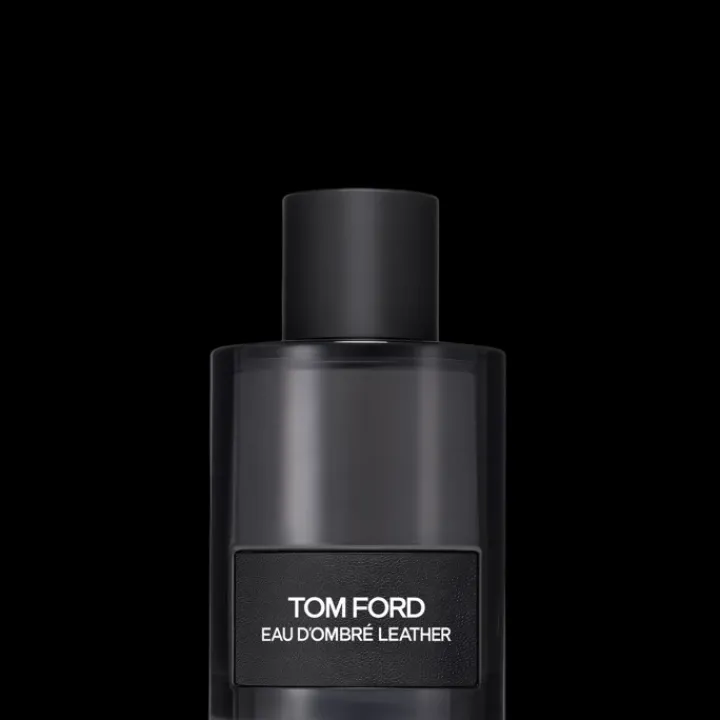 L’Eau d’Ombré Leather est présentée dans un flacon noir translucide avec une plaque en faux cuir.