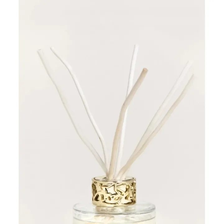 Le mini-cube transparent est surmonté d’une bague en aluminium dorée et six brins de saule pour la diffusion du parfum à froid.