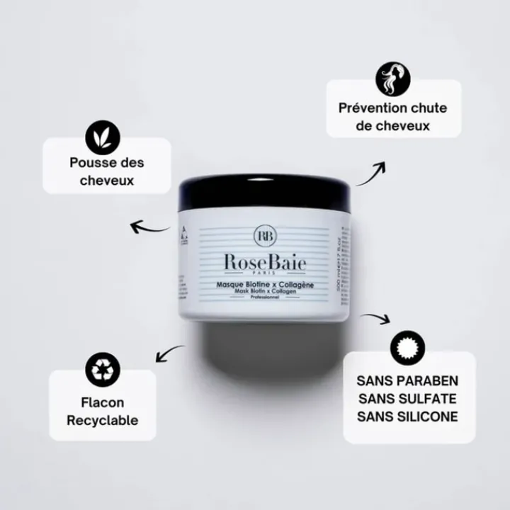 Réparez intensément vos cheveux avec le Masque Biotine & Collagène Rosebaie, un soin profond conçu pour revitaliser et hydrater les cheveux fragilisés.